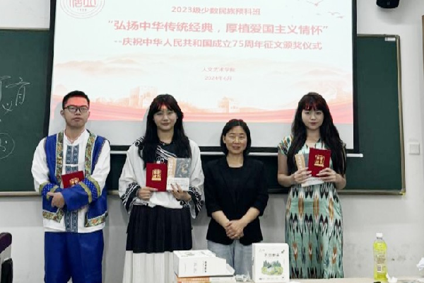 为进一步深化民族团结进步教育,厚植少数民族学生爱国情怀,近日,人文艺术学院2023级少数民族预科班“弘扬中华传统经典 厚植爱国主义情怀”——庆祝中华人民共和国成立75周年征文颁奖仪式顺利举行。预科班全体学生参加仪式,预科班《大学语文》系列课程教师马建红、黄怡出席仪式并为获奖学生颁发荣誉证书和奖品。