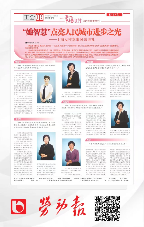 在“三八”国际妇女节来临之际,《劳动报》以《“她智慧”点亮人民城市进步之光 ——上海女性参事风采巡礼》,宣传报道了包括我校党外代表人士、上海市政府参事顾晓敏在内的5位女性参事的风采与成就。