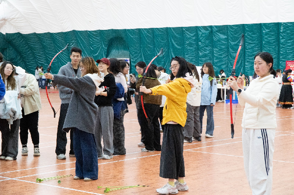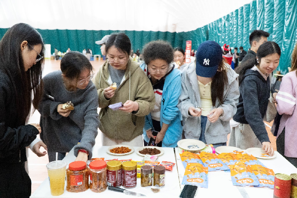 民族美食品鉴区香气四溢,牛肉干、糌粑、奶酪包、苦荞粑粑、三道茶等特色美食集中亮相,展现各民族饮食文化的独特魅力;传统游戏区热闹非凡,竹竿舞节奏欢快、抛绣球轻盈灵动、投壶沉稳有趣、射箭张弛有度,师生们在互动体验中感受传统文化的生机与活力;民族文化鉴赏区内容丰富,树皮画、毡绣等非遗项目与藏文书法、飞花令等活动交相辉映,让师生近距离领略中华优秀传统文化的深厚底蕴;民族服饰展示与竞猜环节精彩纷呈,绚丽多彩的传统服饰成为流动的文化名片,将现场气氛不断推向高潮。
